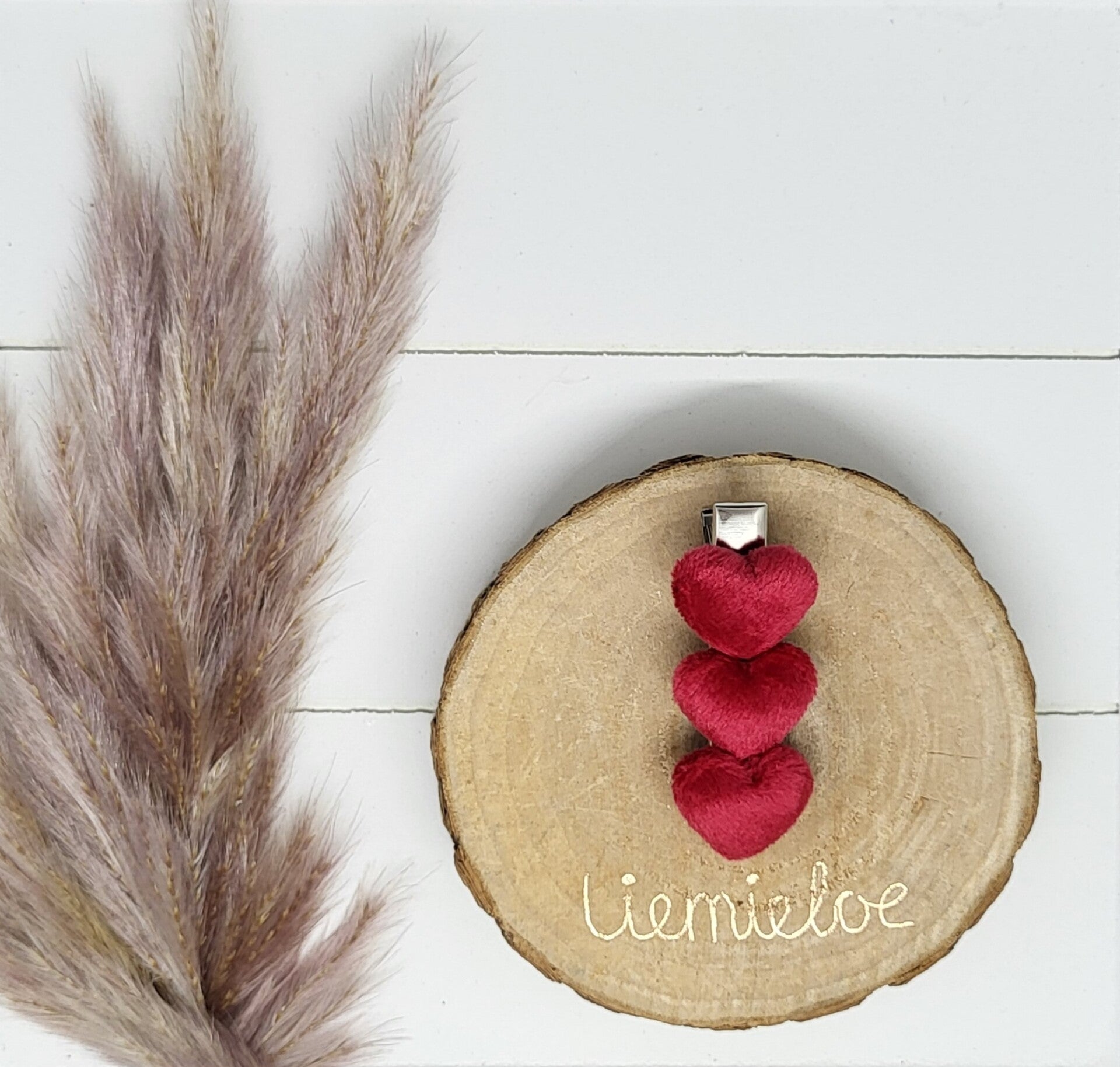 Drie hartjes van fluweel of baby ribstof op een alligatorspeld. Deze speld heeft een lengte van 5 centimeter en is beschikbaar in verschillende kleuren.